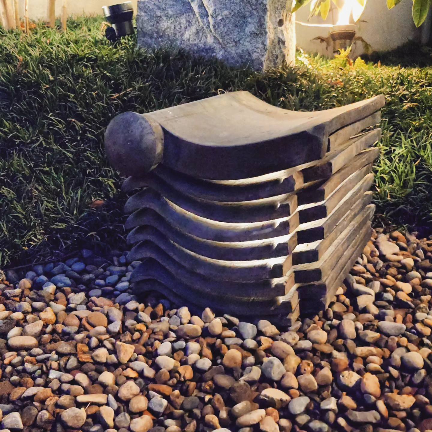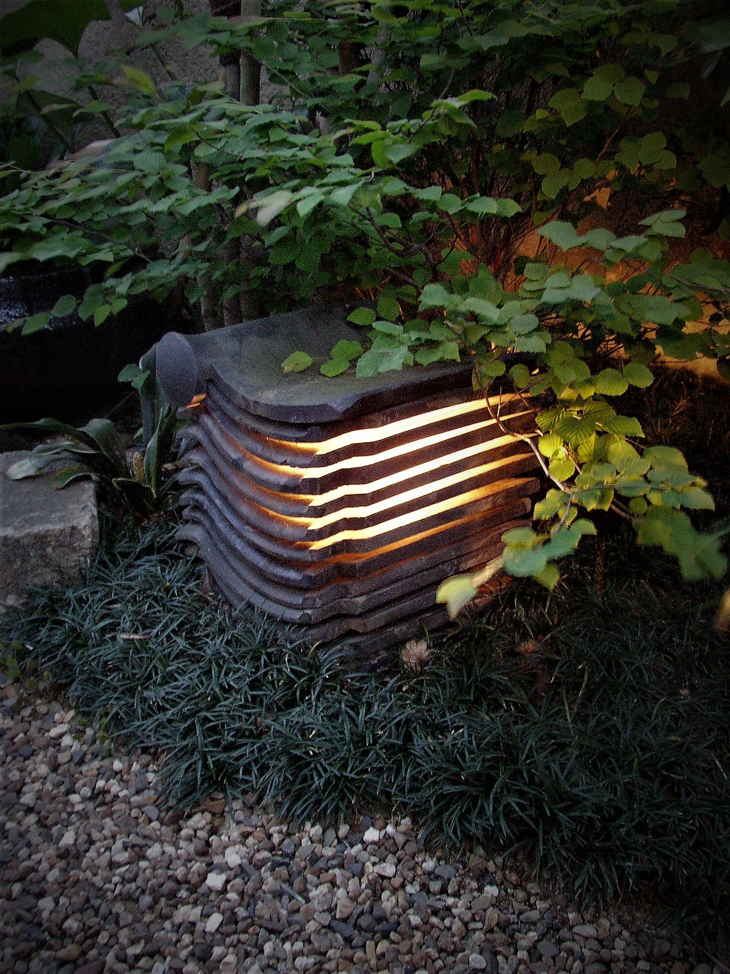 瓦や石、水中ライトなどを使い雰囲気のある庭を目指しています。
