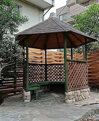 近隣家屋の目線を遮るウッドフェンスや休憩スペース「ガゼボ」